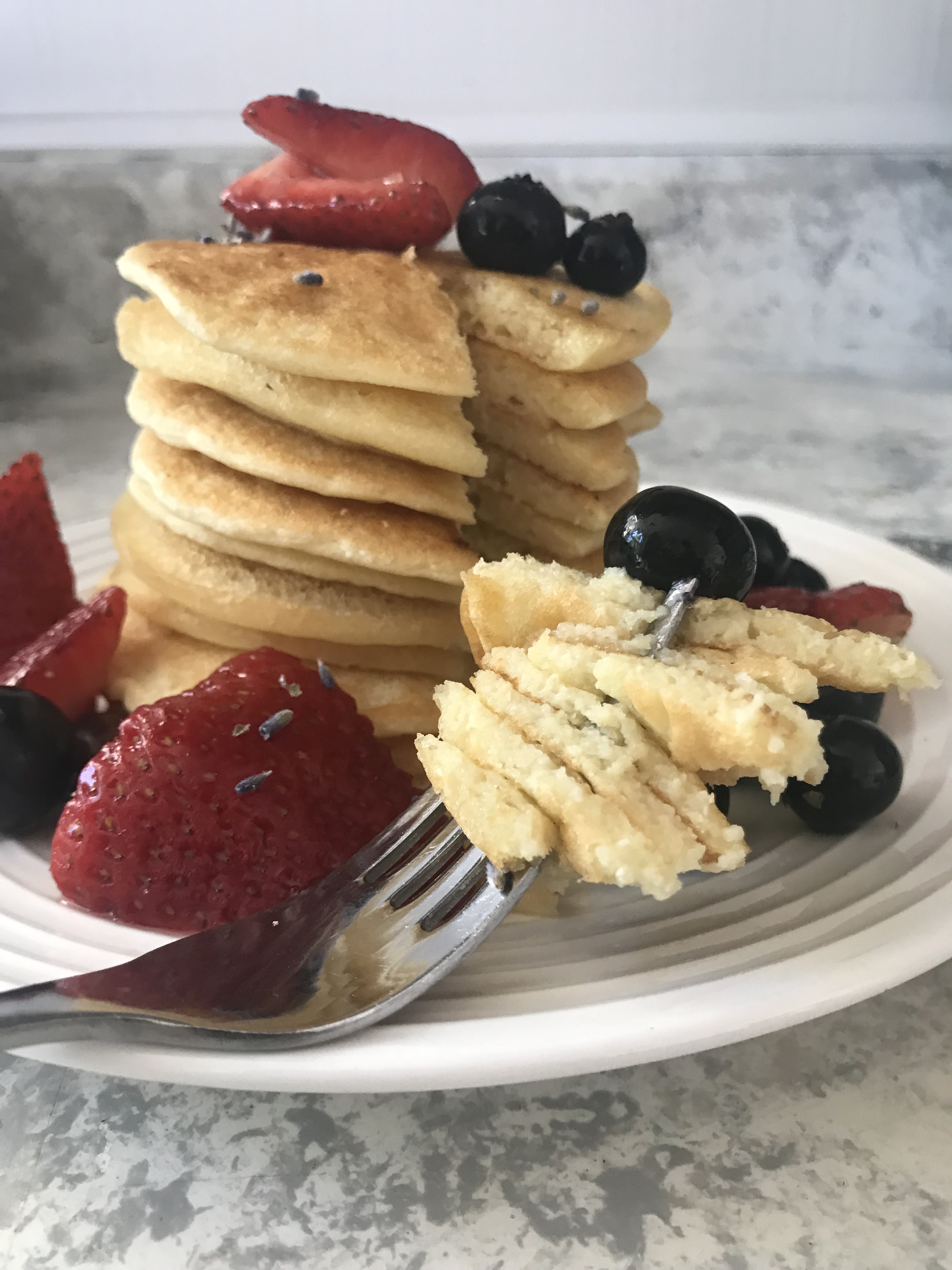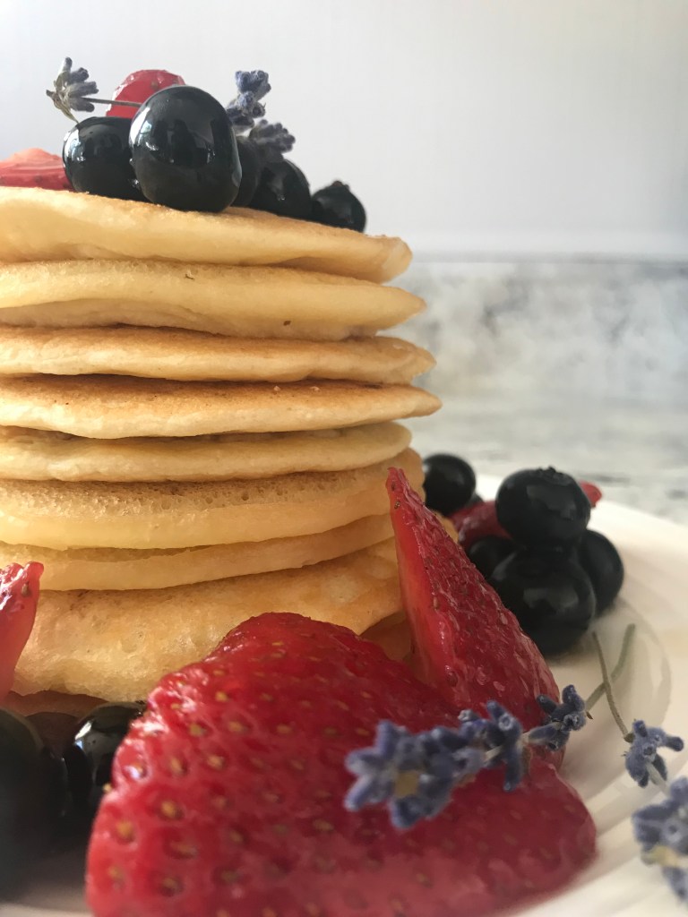 To top these fluffy beauties, I pulled the delights of summer and drizzled Lavendered Berry Syrup all over them. It is the perfect mix of sweet, floral, and tart and goes so well with any breakfast item. Top your oatmeal or your french toast. Layer it onto crepes or fluffy biscuits. Or best yet? Add a few berries and some of the syrup to the bottom of a champagne flute and top with some bubbly for a sparkling brunch partner.