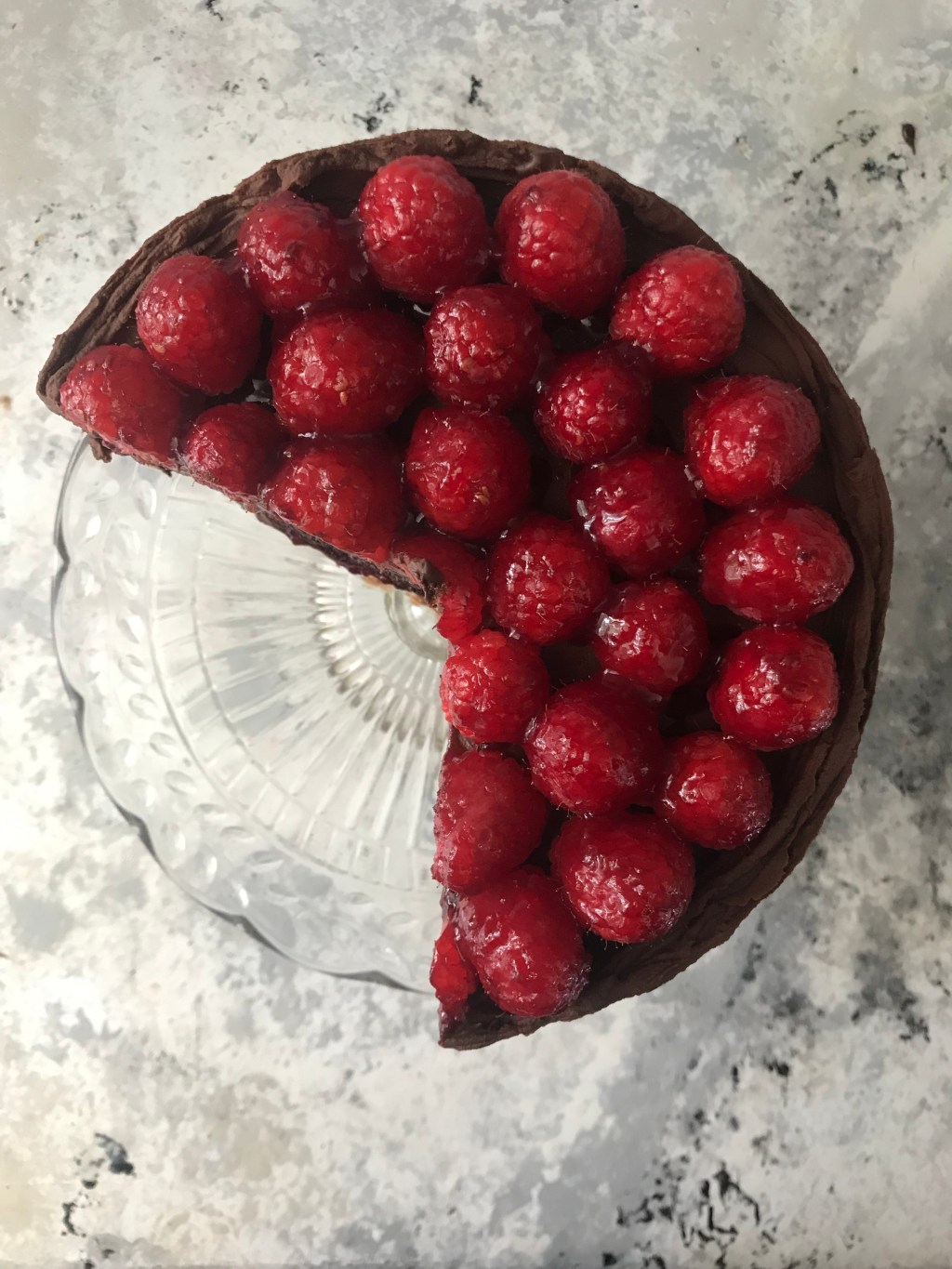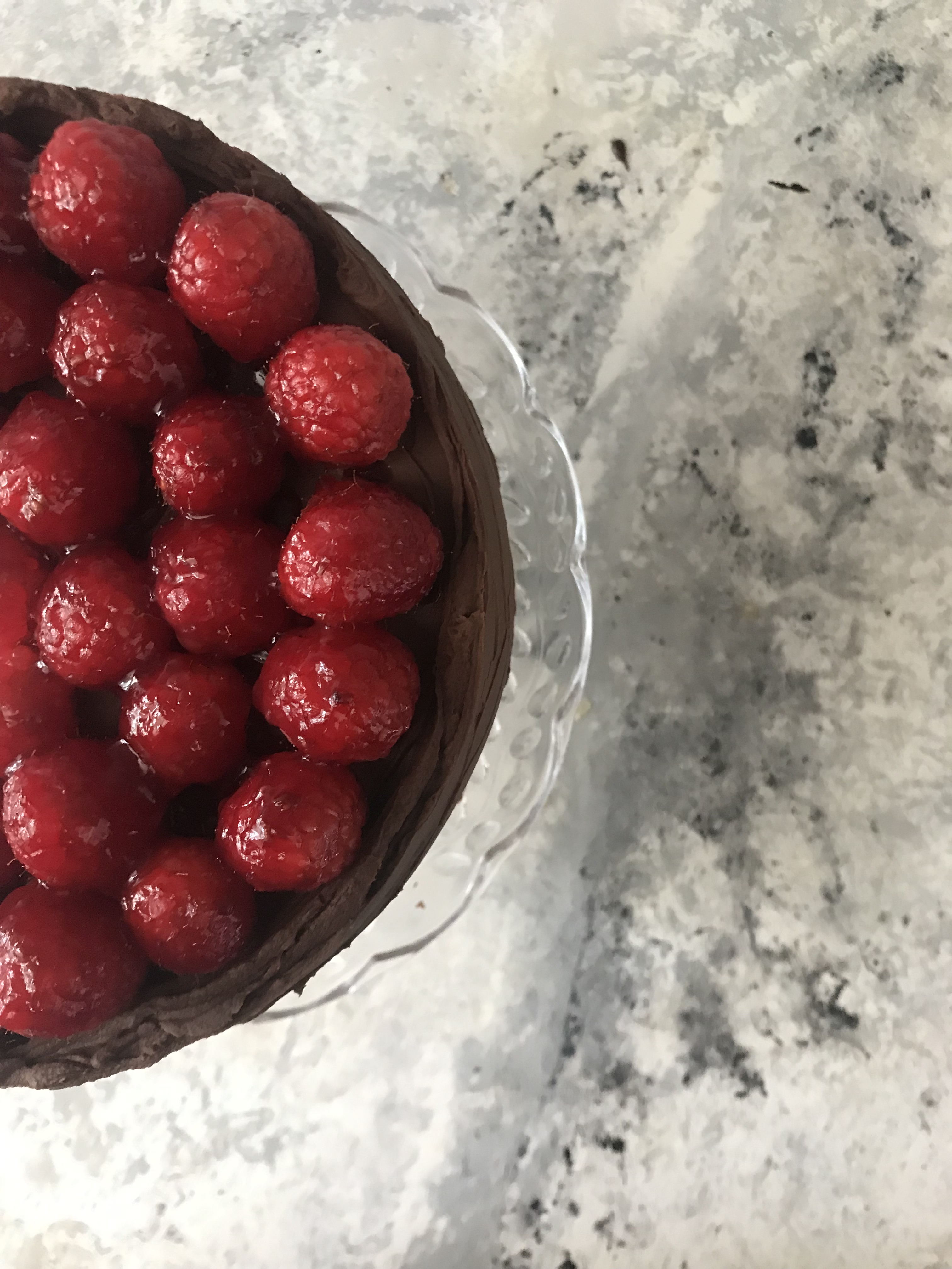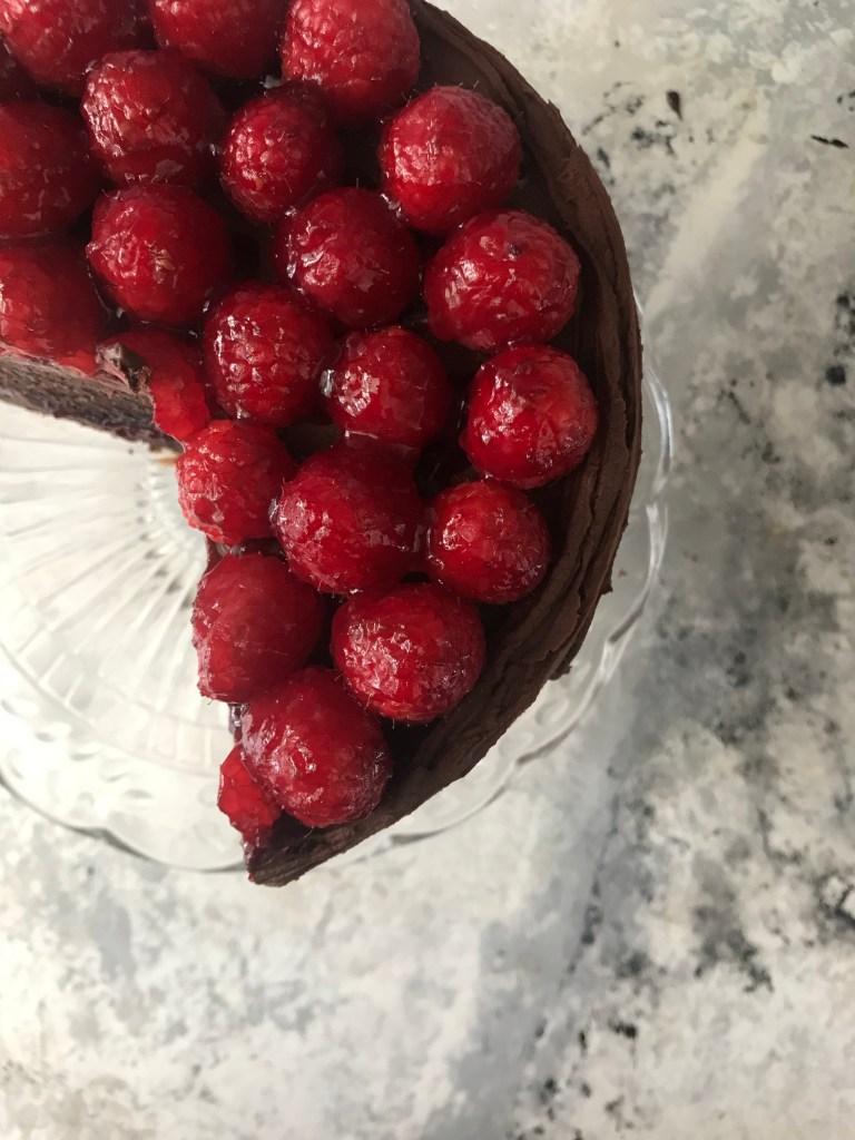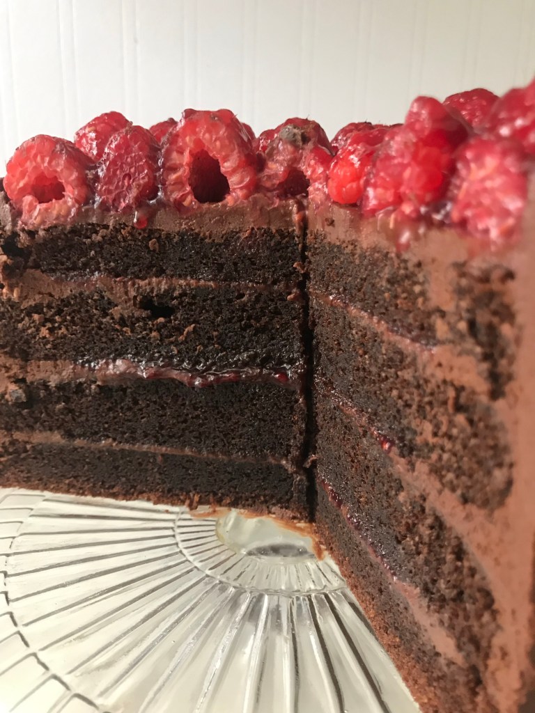 Lay one layer on your cake stand or serving platter and spread a 1/4 thick layer of ganache over the top. Create a shallow well in the frosting center and spread in a layer of jam. Repeat with additional layers and then frost the outside and top of cake. Place fresh raspberries on top however you would like. To make them shiny, warm a tablespoon of the jam in the microwave and brush over berries. Serve and enjoy!