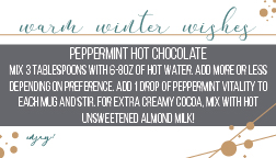 Mix 3 Tablespoons with 6-8oz of hot water. Add more or less depending on preference. Add 1 drop of peppermint vitality to each mug and stir. For extra creamy cocoa, mix with hot unsweetened almond milk!