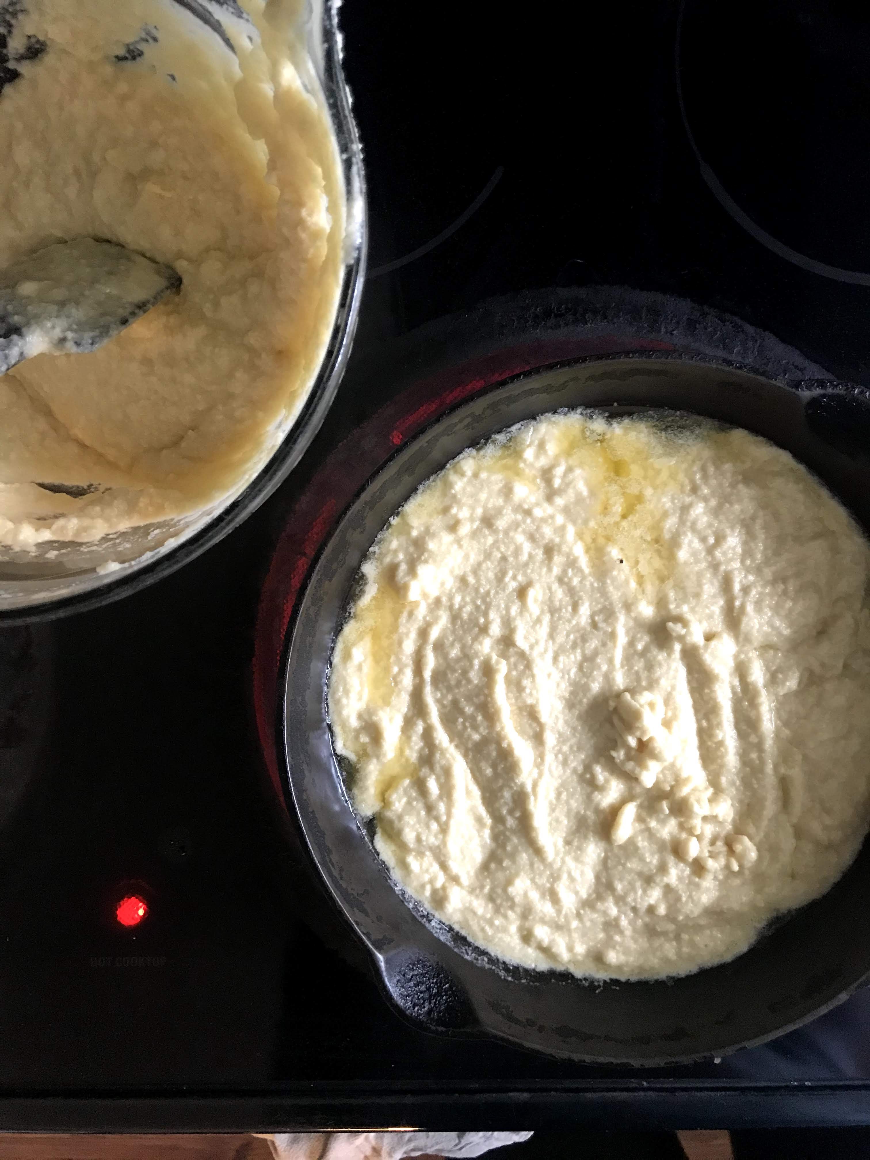 Preheat oven to 375 and begin heating skillet over medium heat. Add the 2 tablespoons of butter (or coconut oil) to skillet and as that melts, begin making your batter.