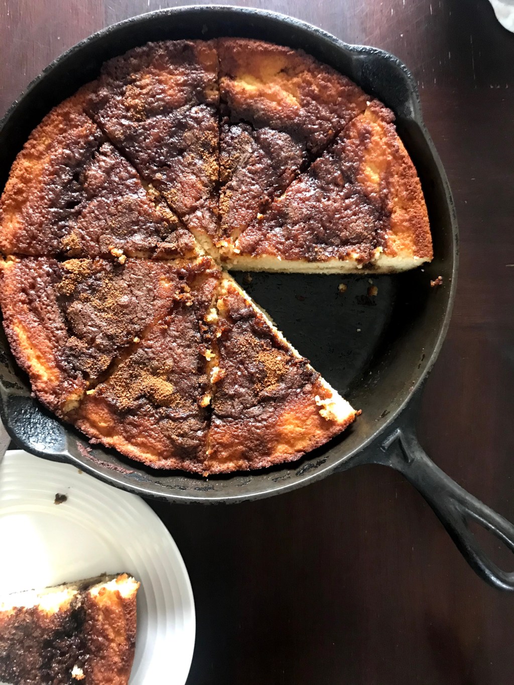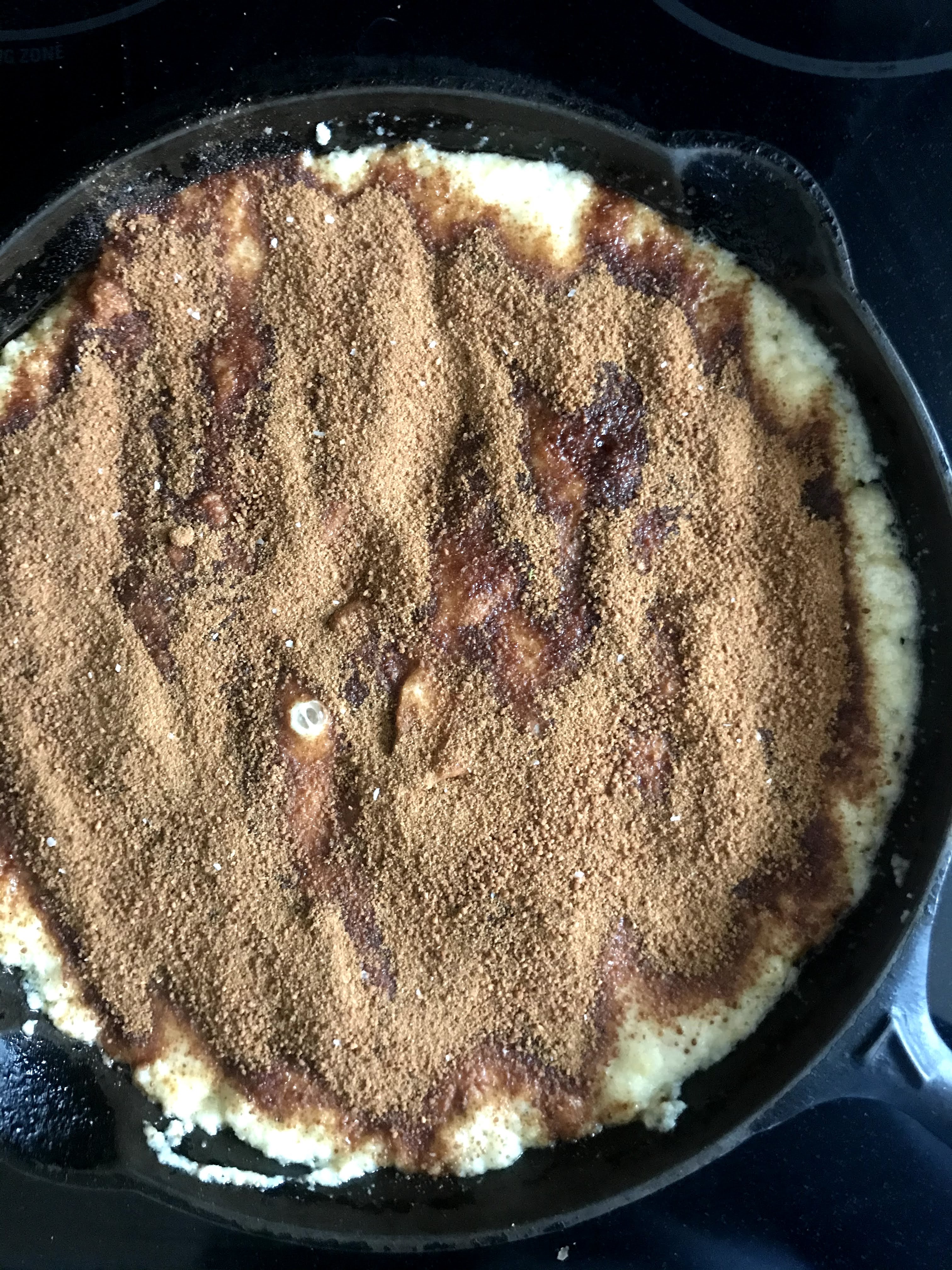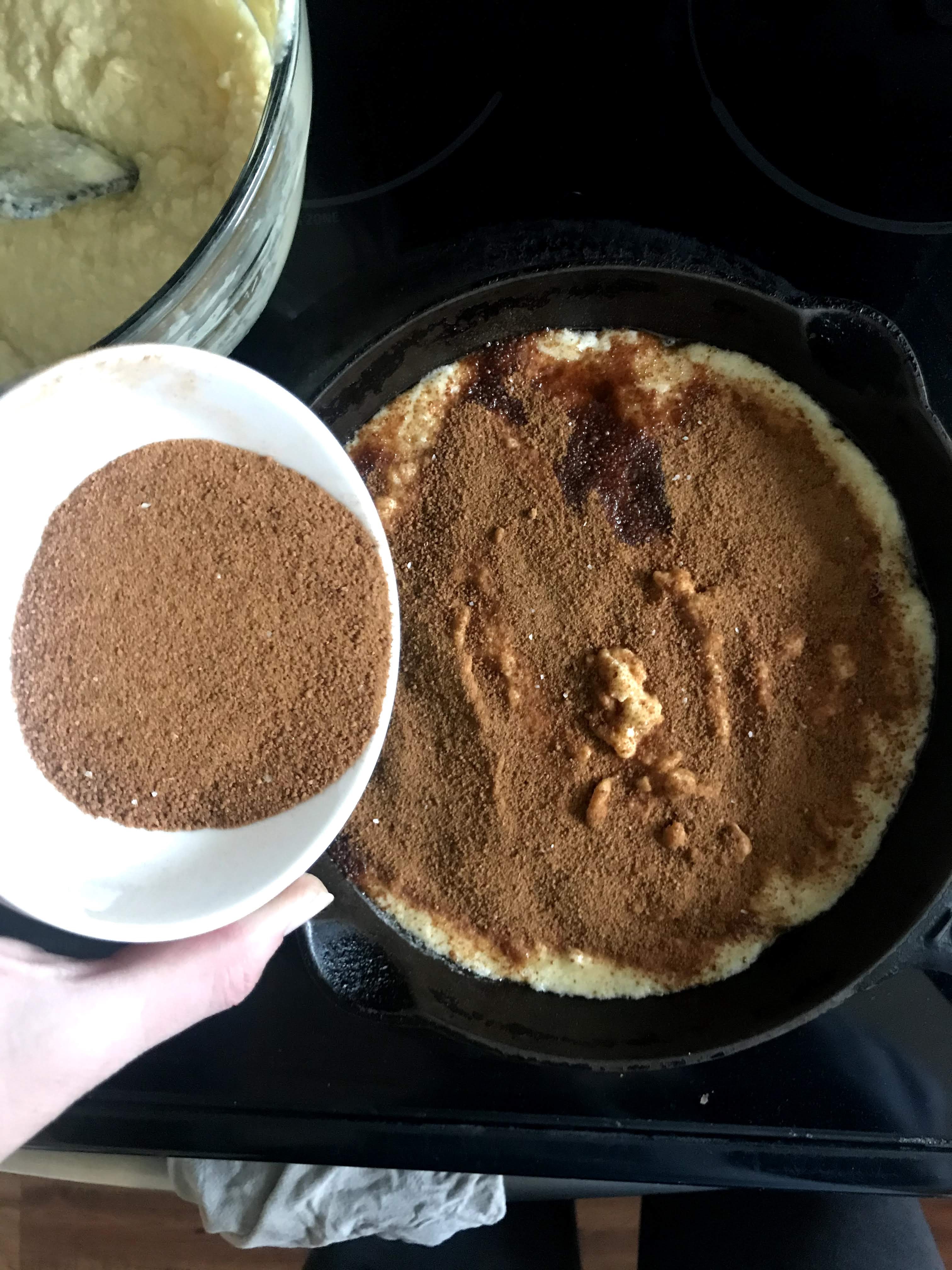 Pour half of batter into warmed skillet, spread evenly, then sprinkle half of cinnamon mixture over top. Layer the remaining batter and top with remaining cinnamon mixture. Let cook for 2-3 minutes then place skillet in oven and bake for 28-30 minutes until golden brown and a knife inserted in the middle comes out clean.