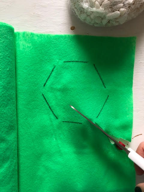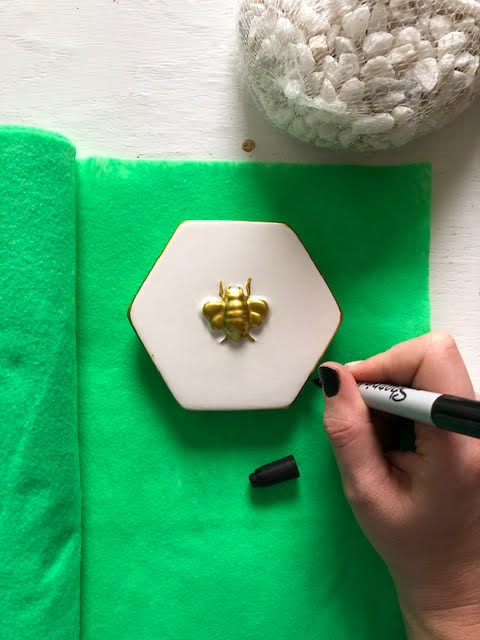Take a Sharpie and draw a cut line with the bottom of your container by setting it on top of a piece of felt and tracing around the container. Then cut it out and place it inside on the bottom of your container. Fill with decorative rocks. Not too full – make sure your lid will still fit closed.