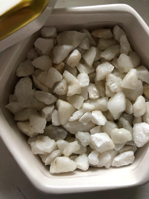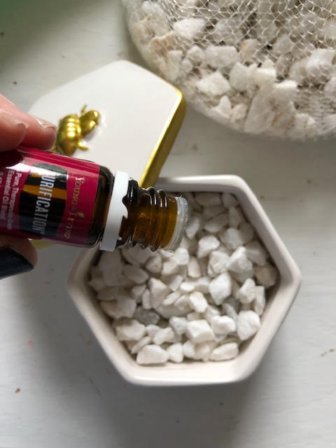 Grab your favorite Young Living blend and drip 30-40 drops over the rocks. Place your container in whatever room needs a little lift (small bathroom, anyone?) and remove the lid whenever a gentle air refresher is needed. My favorite blend for this application is Purification from Young Living.