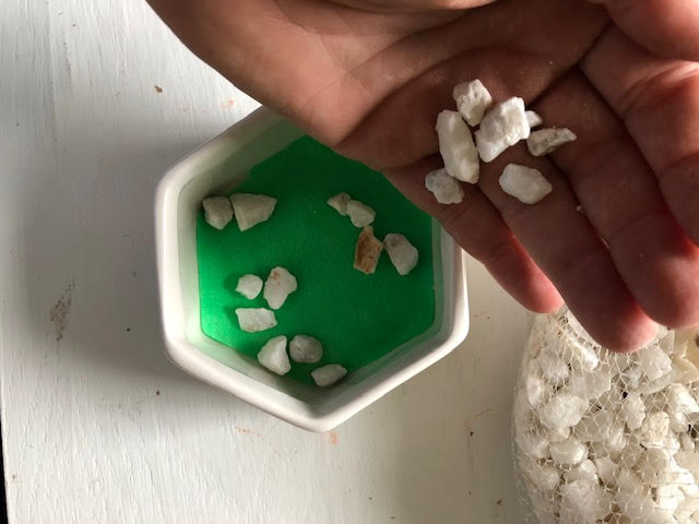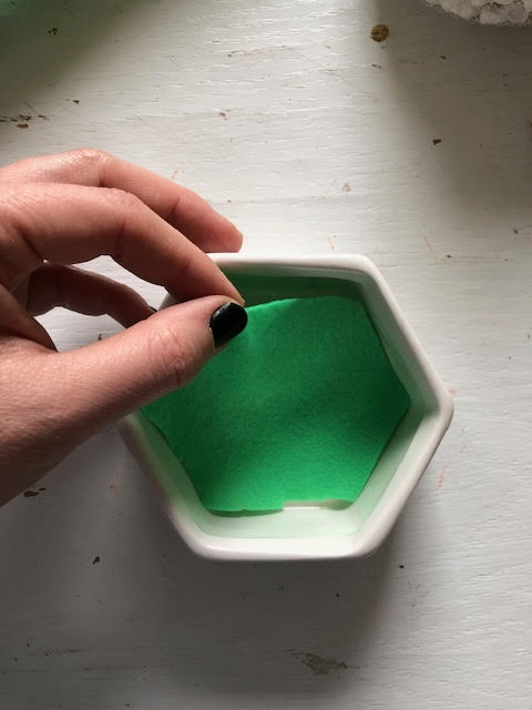 Snag a small roll of craft felt (or a napkin or hand towel), a bag of decorative rocks and a small ceramic container with a lid – Design of your choosing.