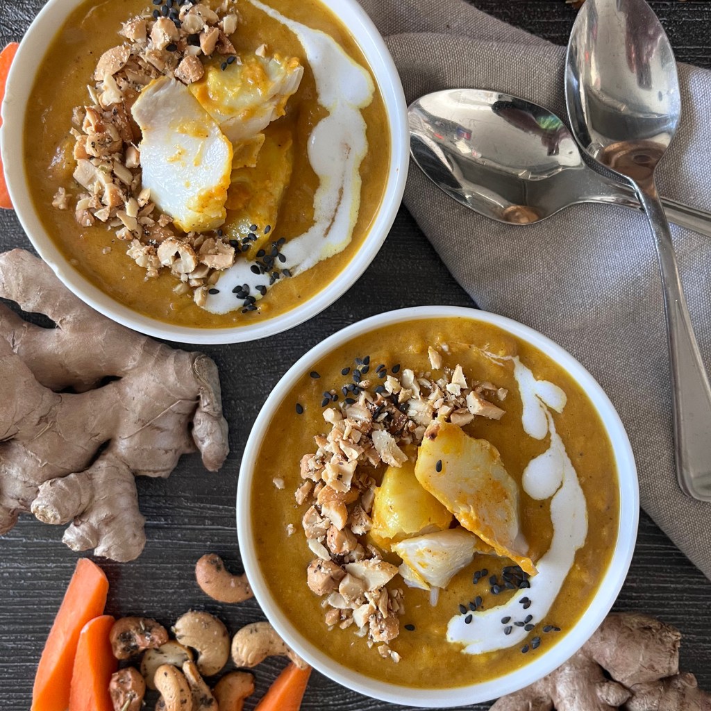 Curried Carrot Ginger Bisque with Poached Cod