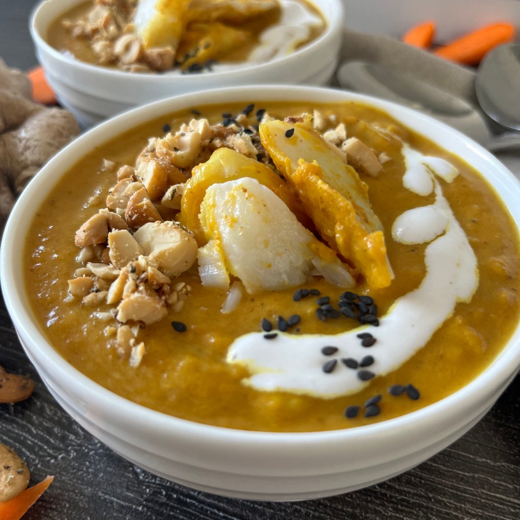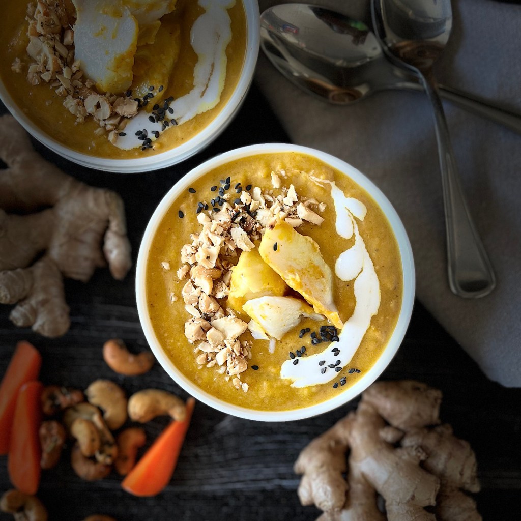 The sweetness of the carrots balances with silky coconut milk and the spicy ginger bringing the soup together. It’s creamy and soothing, filling, without weighing you down. Plus a boost of easily digestible protein is great for a post-workout dinner. Perfect to dip some beautiful gluten free naan bread into. Give it a try and let me know what you think!